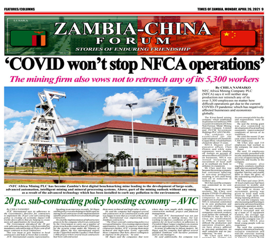 4月26日,贊比亞影響力最大的主流媒體贊比亞時報在“贊中友誼論壇”頭條位置,再次講述了中國有色集團出資企業(yè)中色非洲礦業(yè)公司(簡稱:中色非礦)故事——“疫情下,中色非礦不會裁減任何一個贊比亞員工”。同期財稅專版,還刊載了中色非礦自成立以來累計繳納稅收達2億美元,用行動踐行“中贊合作、共同發(fā)展”理念,積極支持贊比亞經(jīng)濟發(fā)展的專題報道。