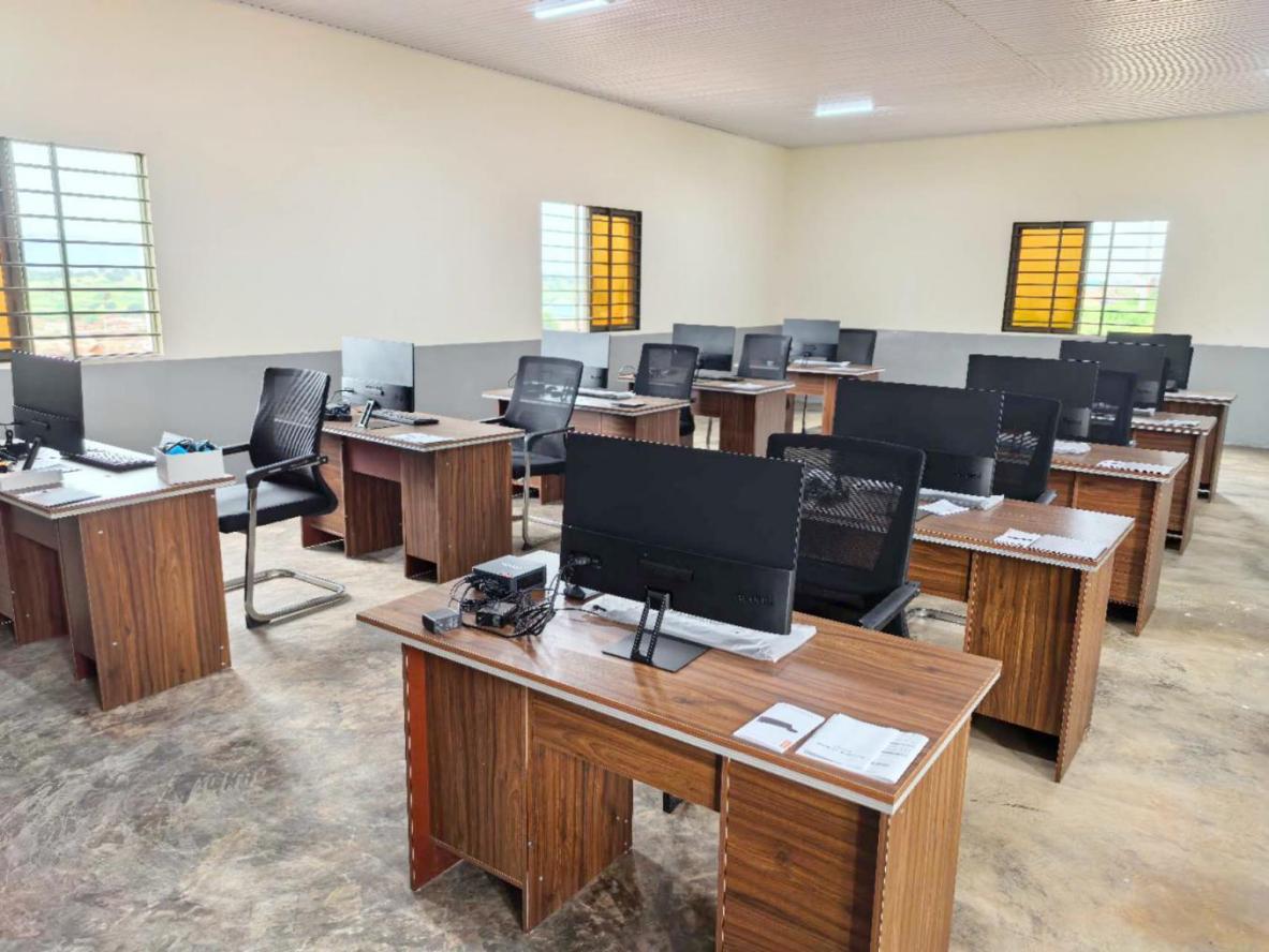職教中心建筑面積1600㎡,共有教室間6間、辦公室1間、電腦室1間、門衛房1間,教室配有臺式電腦、筆記本電腦、縫紉機、講課桌等,并配有教師辦公室、會議室、標準廁所、水井、操場等全套設施。