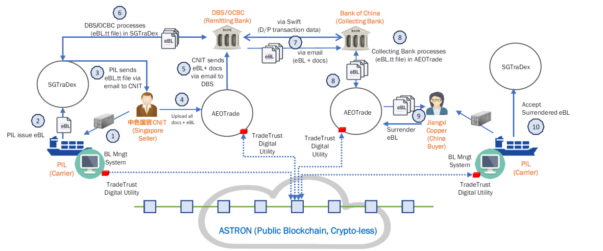 二是驗證可行性,掌握電子提單“試金石”。驗證了電子提單在銅產品貿易中的可行性,通過基于信貿鏈和TradeTrust的平臺進行單據真實性核驗,代收行通過平臺直接驗單,并能夠在線進行權屬轉移,顯著提升跨境貿易融資安全性與效率。