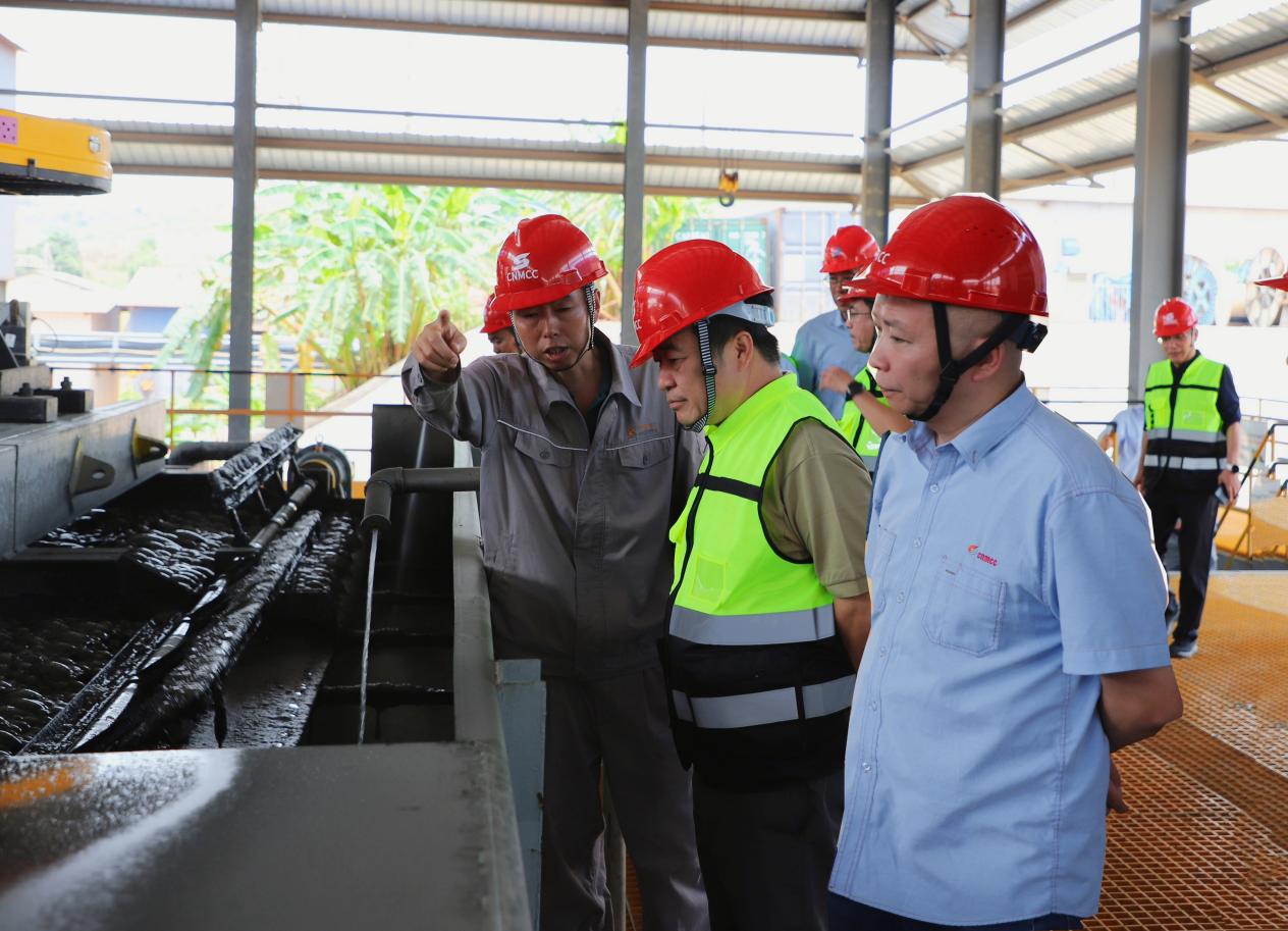 11月6日,在中色剛果,文崗一行前往新建7#、8#尾礦庫、新建制樣間、尾礦庫及潘達尾砂庫、攪浸工序、電積工序和新浮選系統等生產現場實地察看,詳細了解資源開發和工程建設等情況,認真聽取了中色剛果生產經營情況、存在的困難和問題,以及下一步的發展規劃和工作思路匯報。